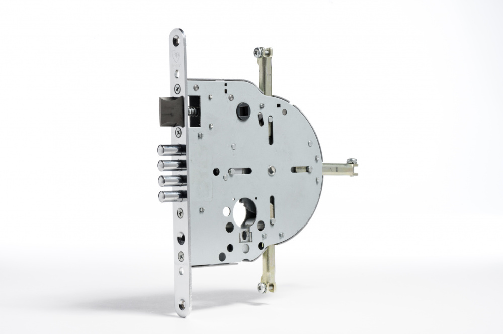ОписаниеВзломостойкий дверной замок Rav Bariach с четырехканальной системой запирания. В составе механизма присутствуют четыре ригеля прямолинейного типа с диаметром 10 мм каждый. В замке используются европрофильные цилиндры с управляющим механизмом в виде шестеренки, которая обеспечивает плавность процесса отпирания.