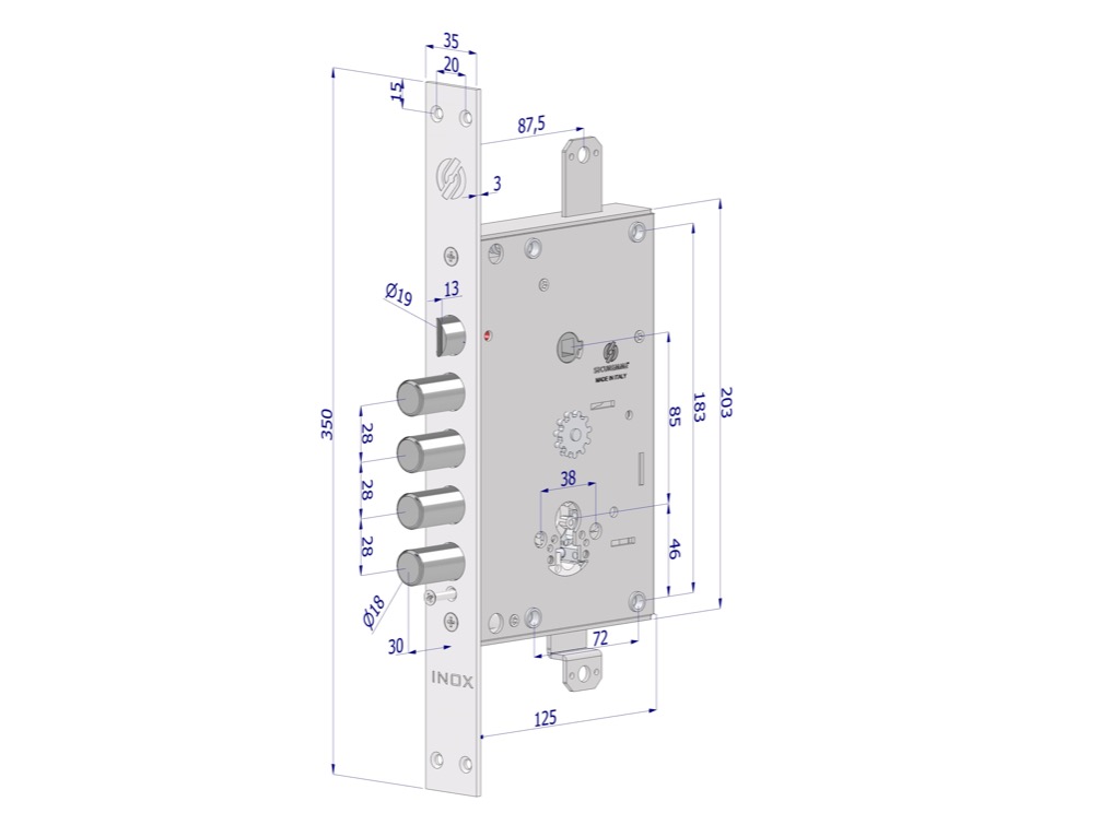 Замок оснащен дополнительной защитой SECURTINA. Эта запатентованная система обеспечивает защиту замка при силовом воздействии. Срабатывает блокирующий элемент ригельной группы и не позволяет ей двигаться.Comfort Gear Lock - инновационный шестерёнчатый механизм гарантирует плавный ход и бесшумную работу.