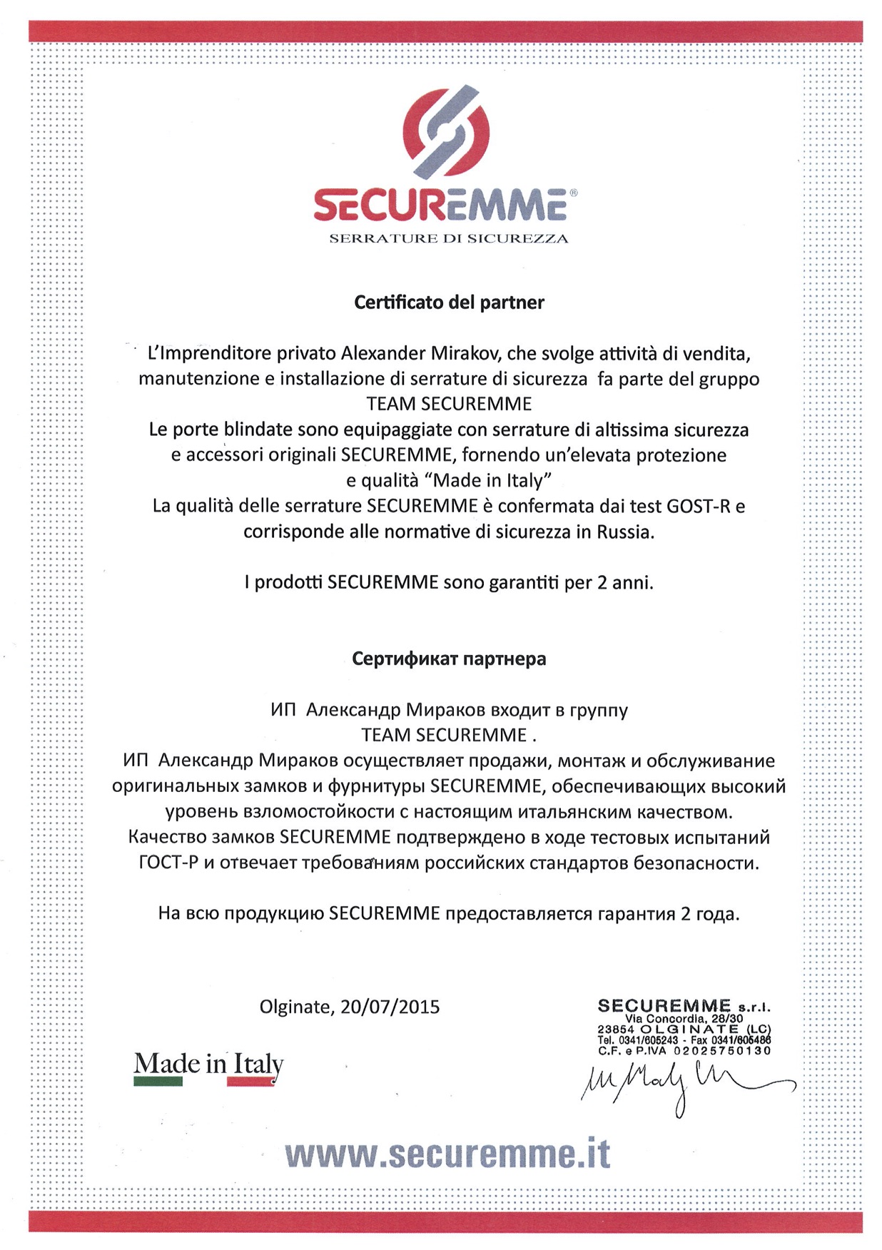 Группа SECUREMME – это авторизованные продавцы и сервисные центры, отобранные предприятием SECUREMME S.r.l.